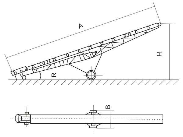 該輸送機(jī)分為可升降型及不可升降型兩大類,輸送帶的運(yùn)行靠電動滾筒驅(qū)動,整機(jī)的升降與運(yùn)行均為非機(jī)動。